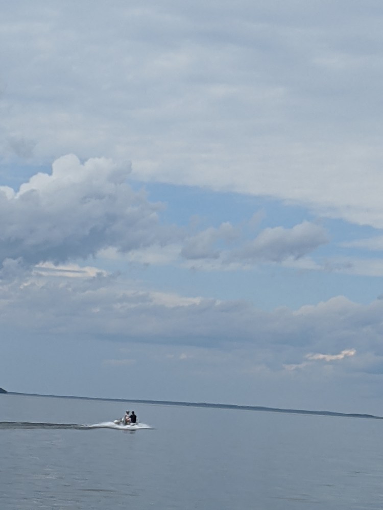 In Willsboro Bay we tied up to a mooring ball, which is like being out on anchor but a bit less to worry about as they are secure to the bottom, you don’t have to use your own anchor and the labor that entails. Then part of the day was beautiful and sunny. We took turns zipping around the bay in the dinghy. Quite beautiful.
