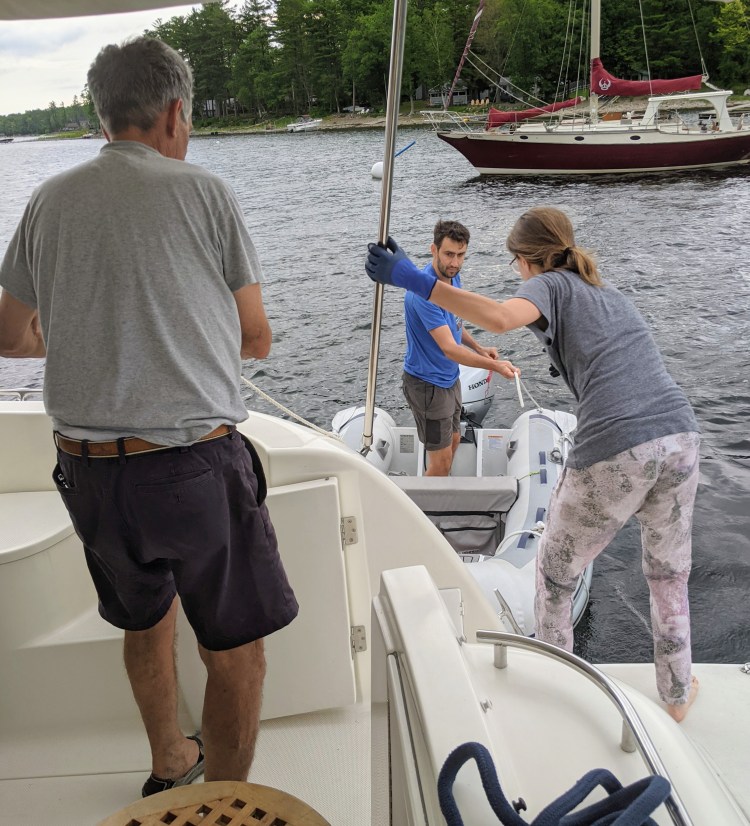 Jim and I woke up around 6a while here on anchor. Jim says he is going to dink in to shore to use the bath house facilities while Katie and Brian are still sleeping. He heads out as I stay in bed looking at email. A minute later he comes back in wild eyed, the dinghy is gone! I come up, in pj’s and we scan this vast Bay -wider than the Barnegat- using binoculars. The dinghy could be on shore, have drifted out to Lake Champlain, who knows where. Jim spots a small boat , checking with binoculars, about a half mile a way it does appear to be the size of our dinghy and no one is on it, in the middle of the bay. So we wake up Katie and Brian, release Irish Eyes from the mooring and slowly putter out to it. Brian climbs aboard the dinghy and drives it back toward the mooring as Katie and I re-attach the mooring. Just another peaceful morning of boat life.