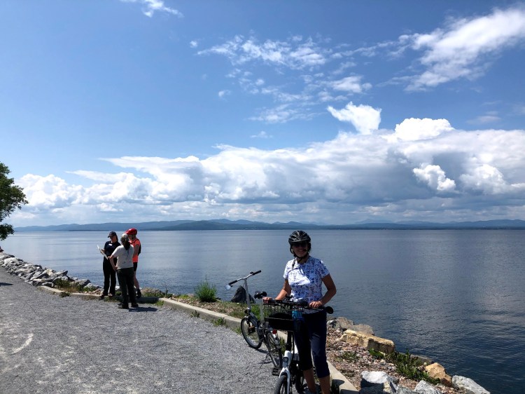 Jim and I wanted to ride our bikes over the Colchester Causeway, an old railroad bed that is now a gravel path with Lake Champlain on both sides and is used as a biking/hiking path. We had hiked a part of it a few days ago. It crosses Malletts Bay, connecting Colchester to South Hero. At the far end there is a ferry to transport you across the one small section that is open for boats to pass through. However, when we arrived at the ferry we found out that once we were transported across we would need to bike another 4 miles to get food. And we were already hungry! So we turned around. After riding a total of 12 miles, with just three more to get back to the house I ran out of battery in my electric bike and my legs, and had Kelly come pick me up. Jim was more determined and continued on home. Still it was an enjoyable ride.