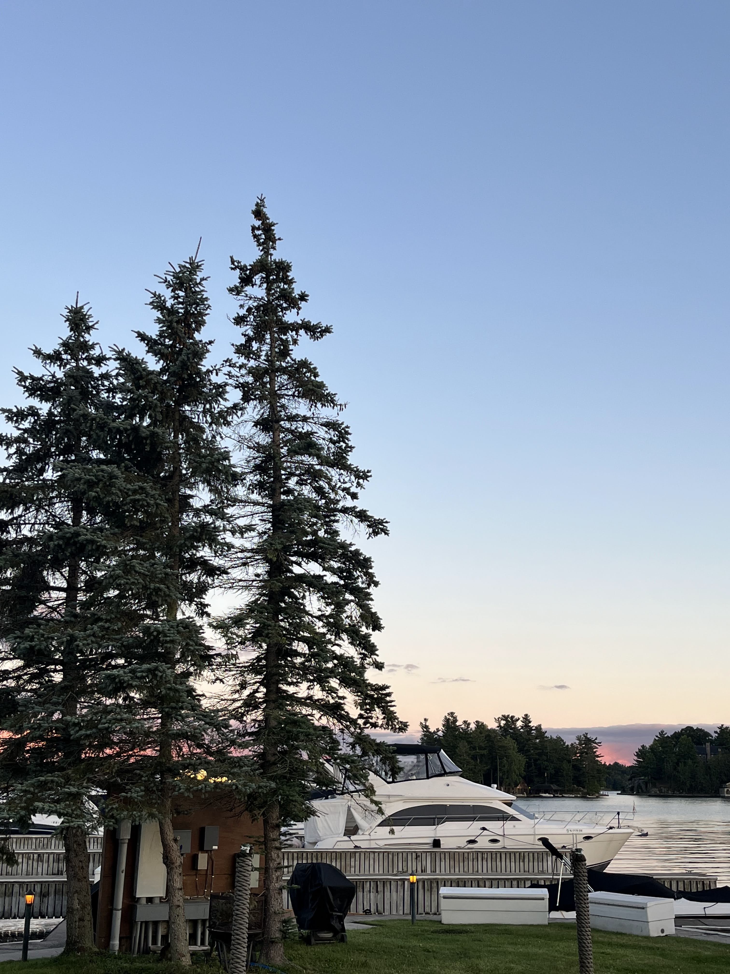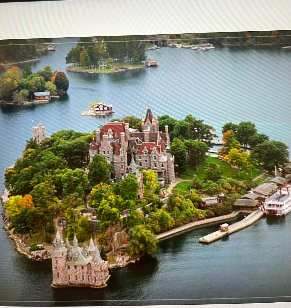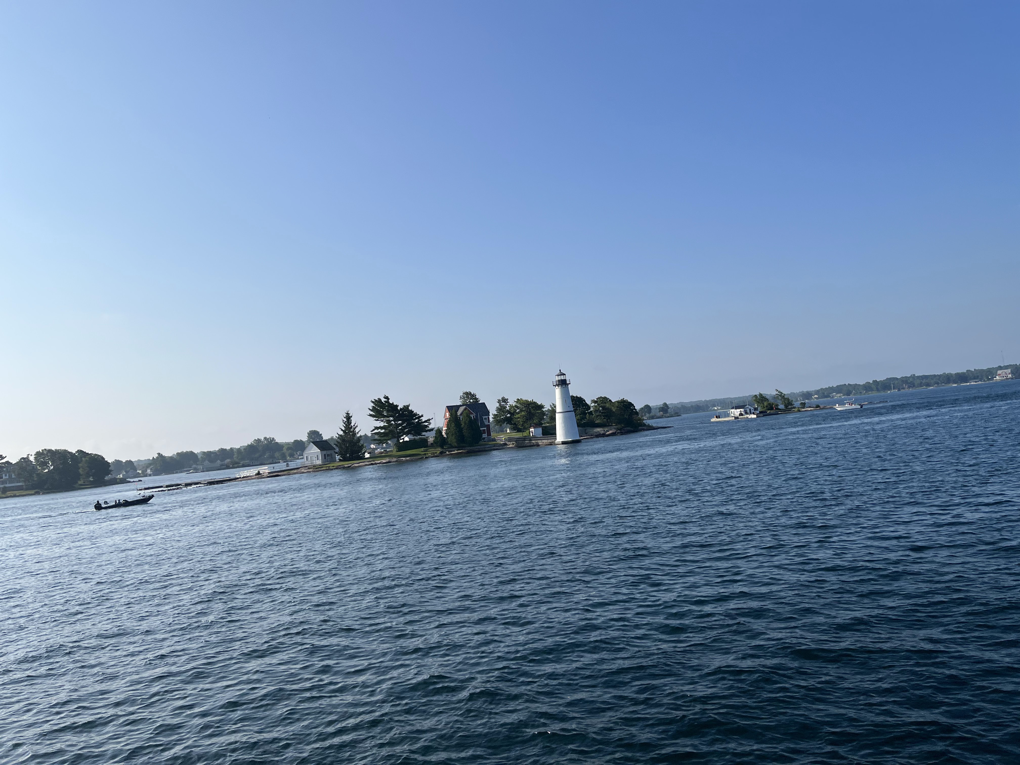 Kingston is on the eastern end of Lake Ontario. Somewhere, invisibly, we cross back into U.S. waters. No need to pass through immigration although we did need to upload our photo ID to a U.S. Customs app the night before. We proceed up the St. Lawrence Seaway into the Thousand Islands. There are actually many more than a thousand and many of these very small, couple of acre properties, have a house on them. I think it could be cool to stay on one for a weekend, but more than that seems like just a hassle. The majestic evergreens, right on the water’s edge make it feel like a northern waterway.