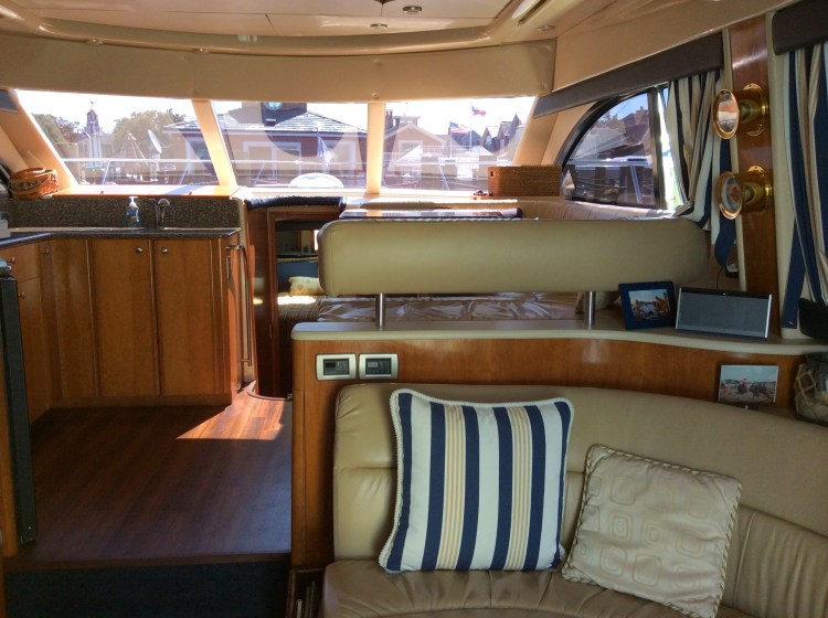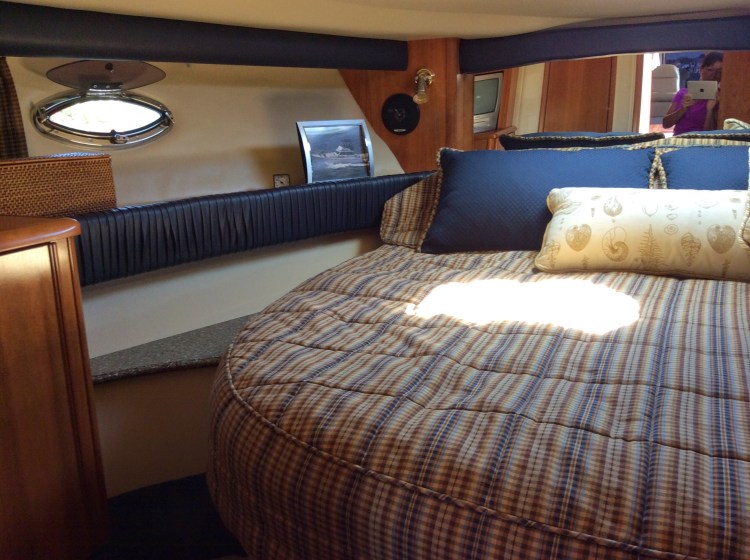 It has 2 staterooms, 2 heads and best of all, the galley has 360 degree views. How I hated twisting my head to look out the port hole in our previous Irish Eyes galley. Just as at home, you spend a good bit of time in food prep and clean up and the view I have now is a delight! In the galley we have a microwave/convection oven, an electric cooktop and a small refrigerator. We like the safety of using the instapot, and get good use from the grill which is mounted on the swim platform.