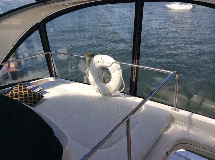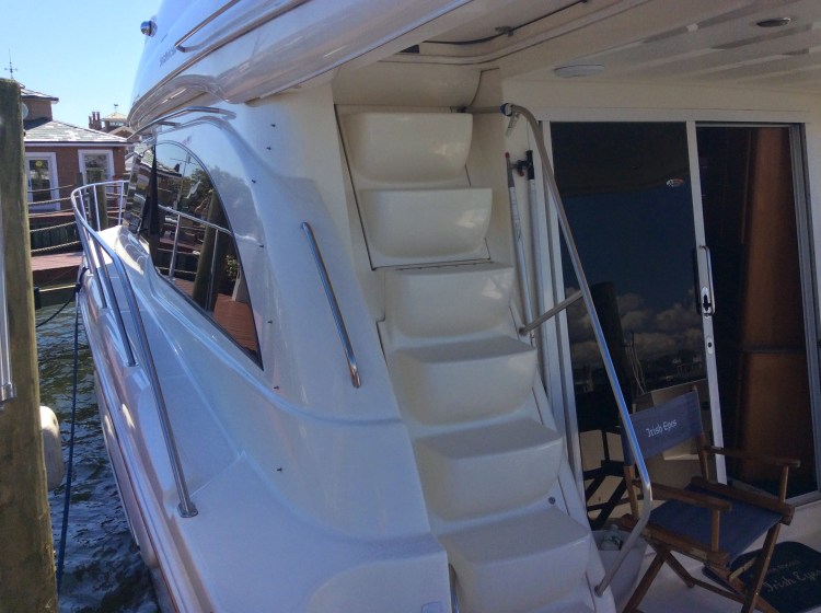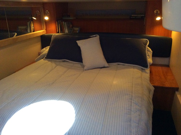 Irish Eyes is a 2004 Meridian 411 which we purchased in 2010. The LOA (Length Overall- includes swim platform, bowsprit) is 46′ and has a beam of 14.2.